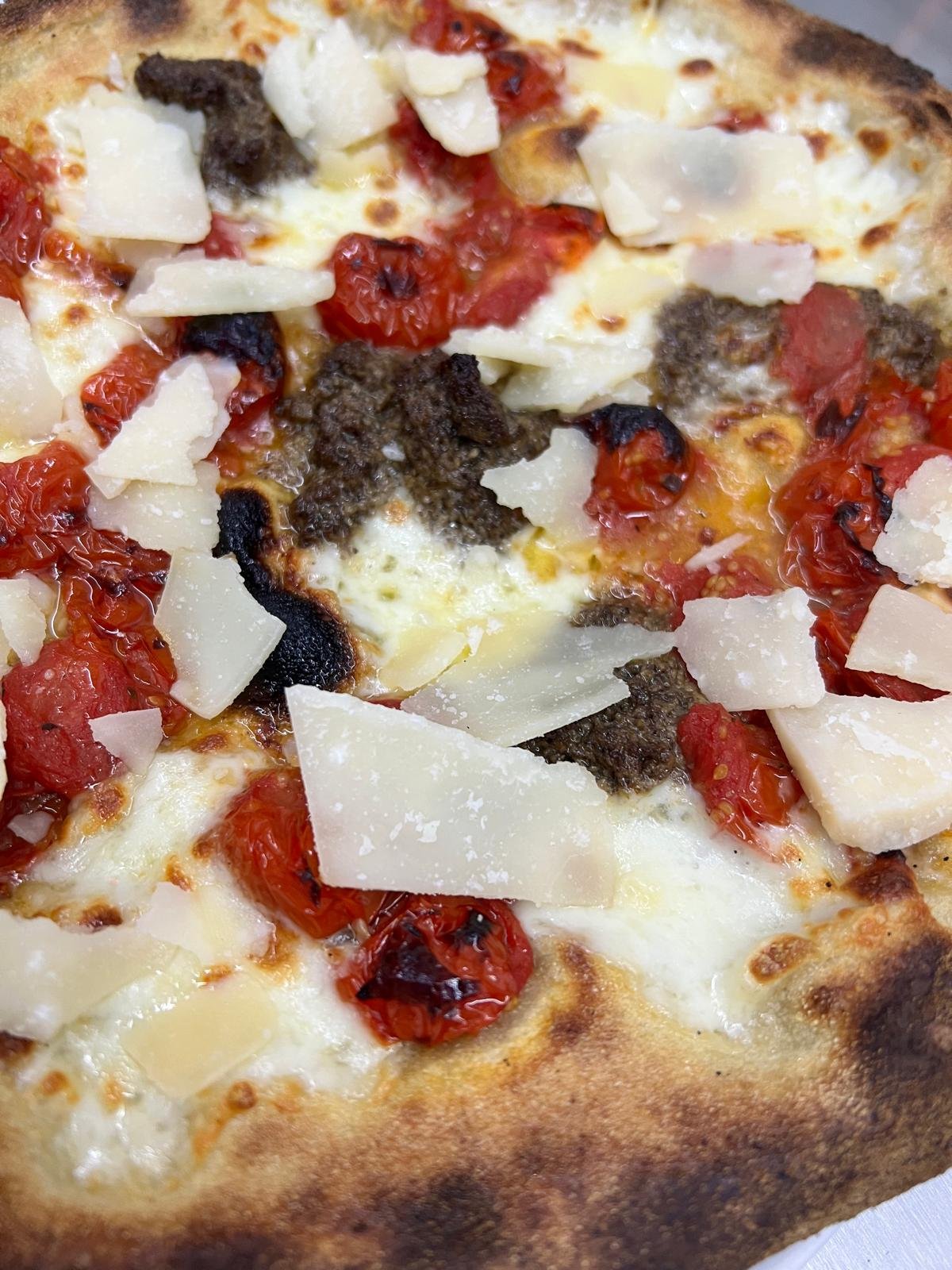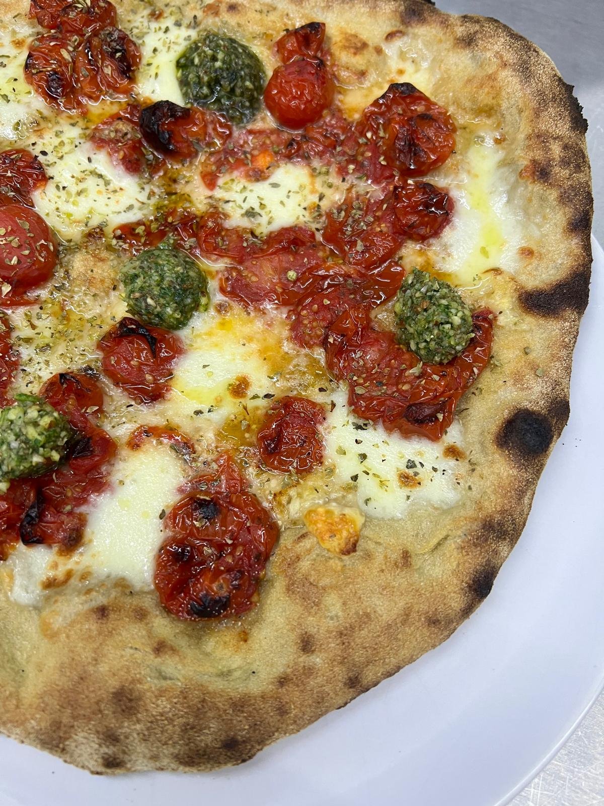 Mozzarella – parmesan – tomate cerise confite – pesto roquette amande – huile d’olive – origan