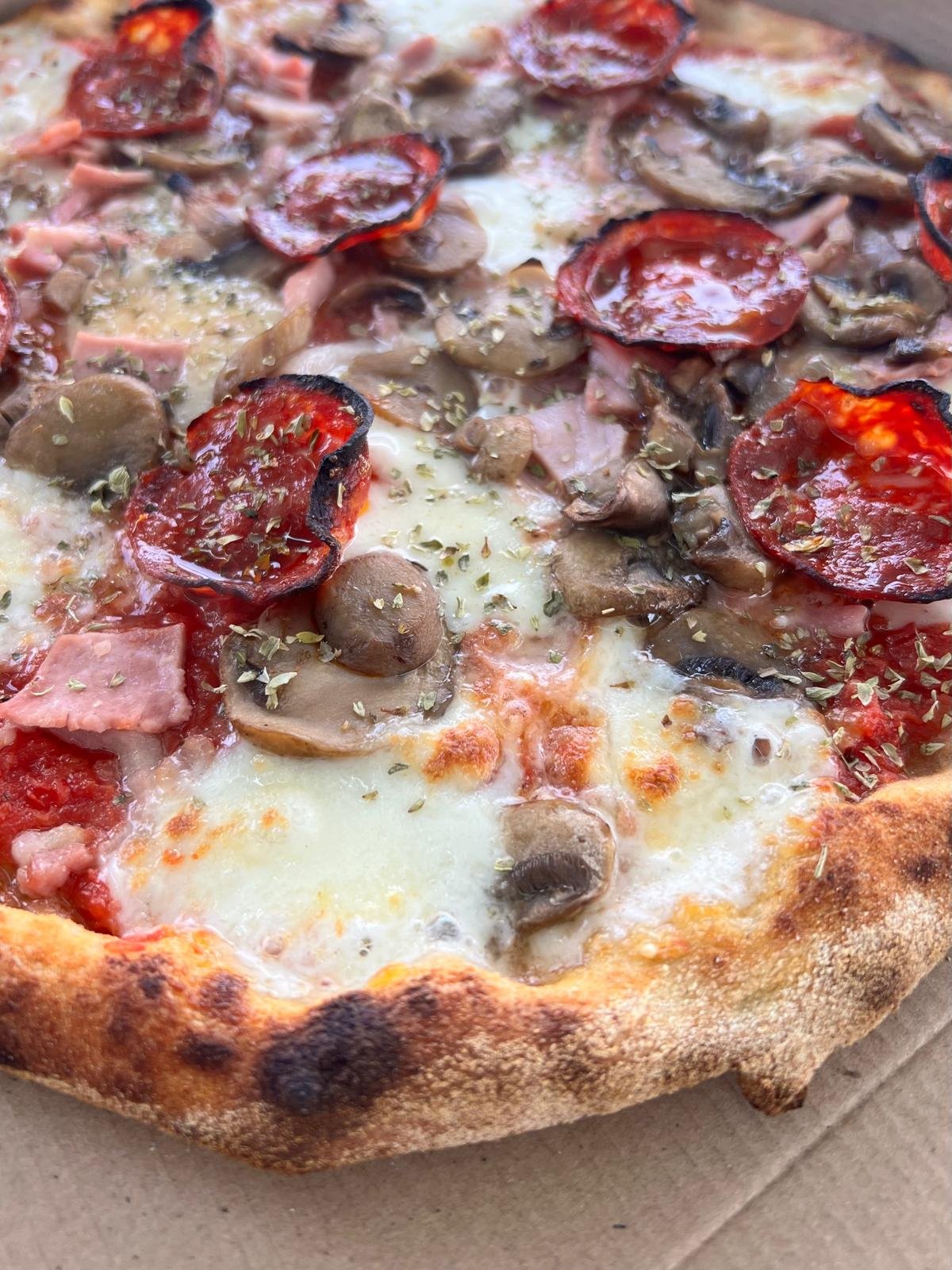 Sauce tomate – mozzarella – parmesan – jambon – champignons – chorizo – lardons – origan